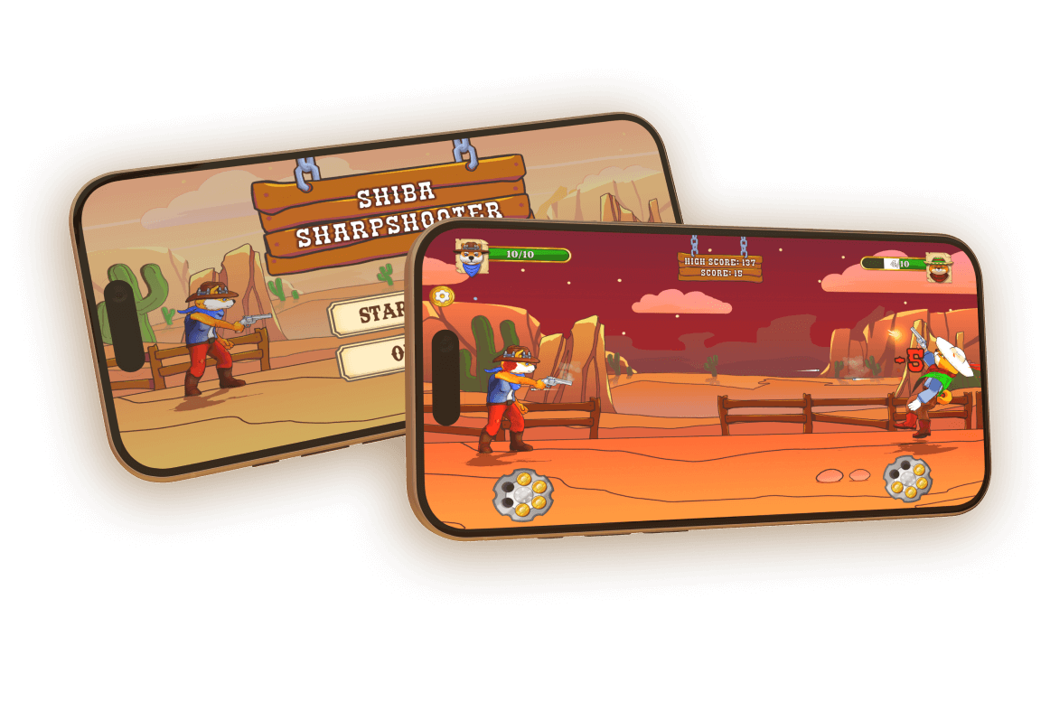 The wildest gunslingers in the west gather in Shiba Sharpshooter, our Play-to-Earn (P2E) mobile game. Immerse yourself in dramatic duels where timing and precision are key. Draw your weapon and take down outlaws to become the ultimate marksman - with $SHIBASHOOT tokens maximizing your abilities. Download today! (Web3 app coming soon)
